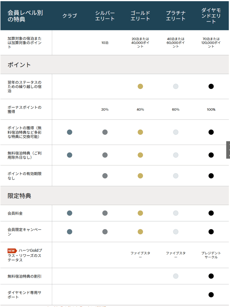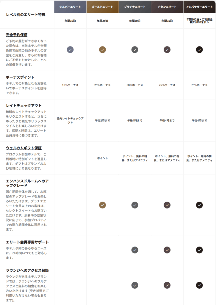 - 会員のステータスによってレイトチェックアウトやルームアップグレードが利用できる